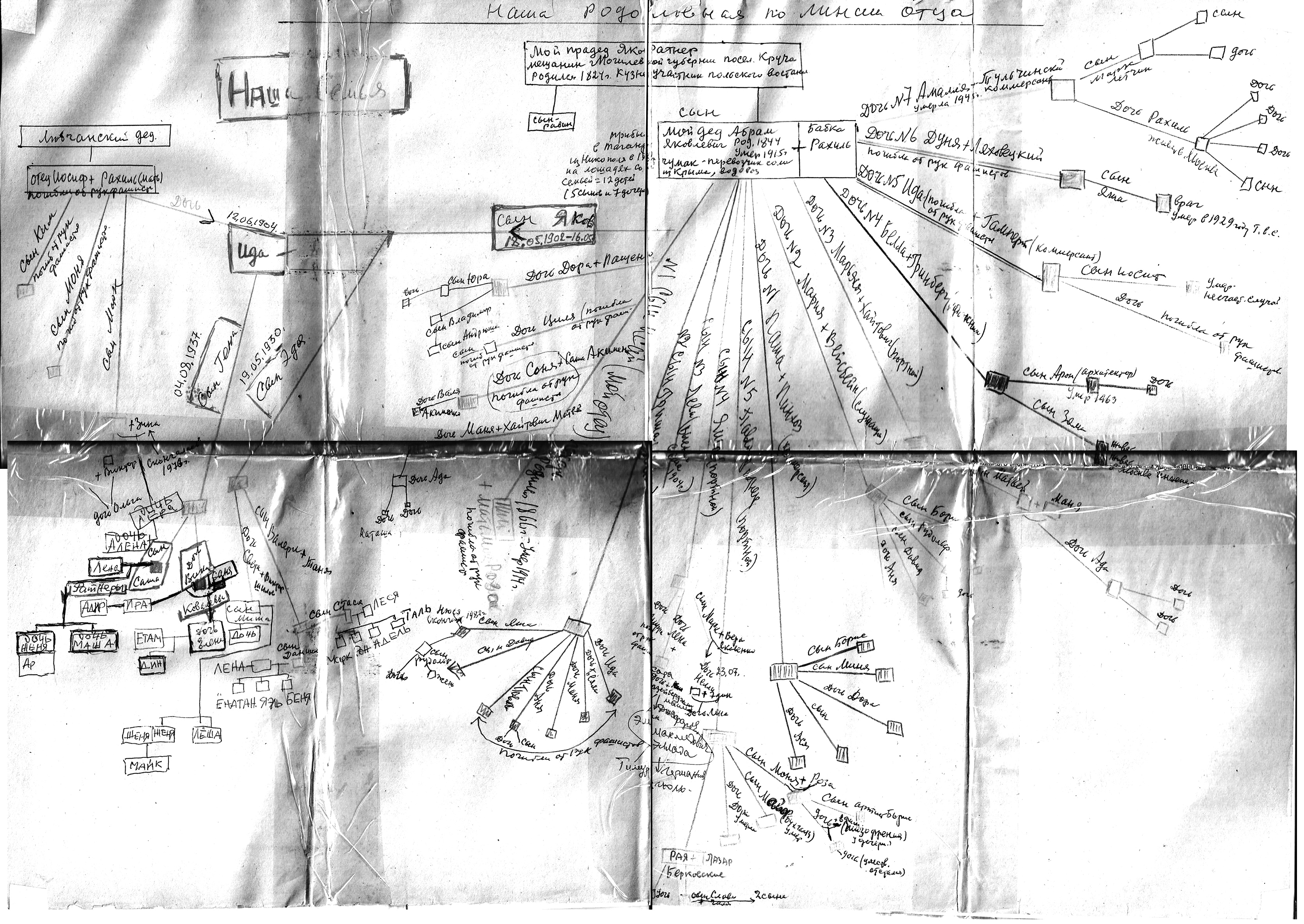 У «корней» дерева – родоначальники: Яков Ратнер (1824 г.р.-?. Могилёвская губ.) и Яков Любчанский (? г.р. -1921. Минская губ.). Наш папа – тоже Яков (Исаевич). Так что, корневое имя всей нашей родословной по линии и папы, и мамы – Яков.